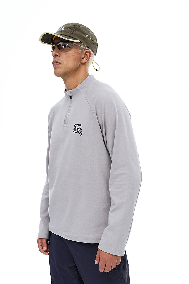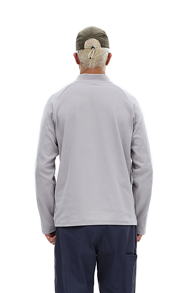 A long-sleeve tee with stand collar and half-zip closure for ventilation and edge. Cut from a stretch jersey knit that moves with you and holds its shape.