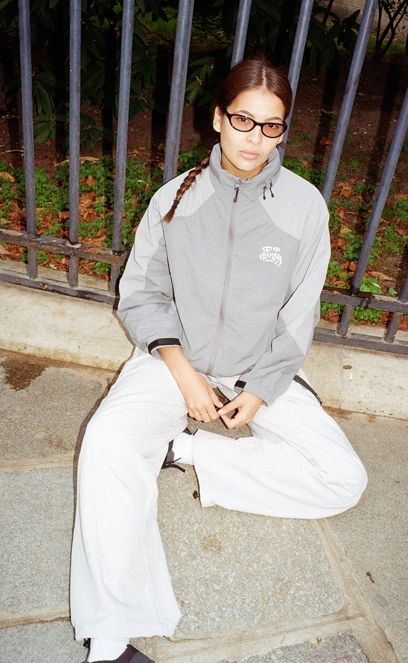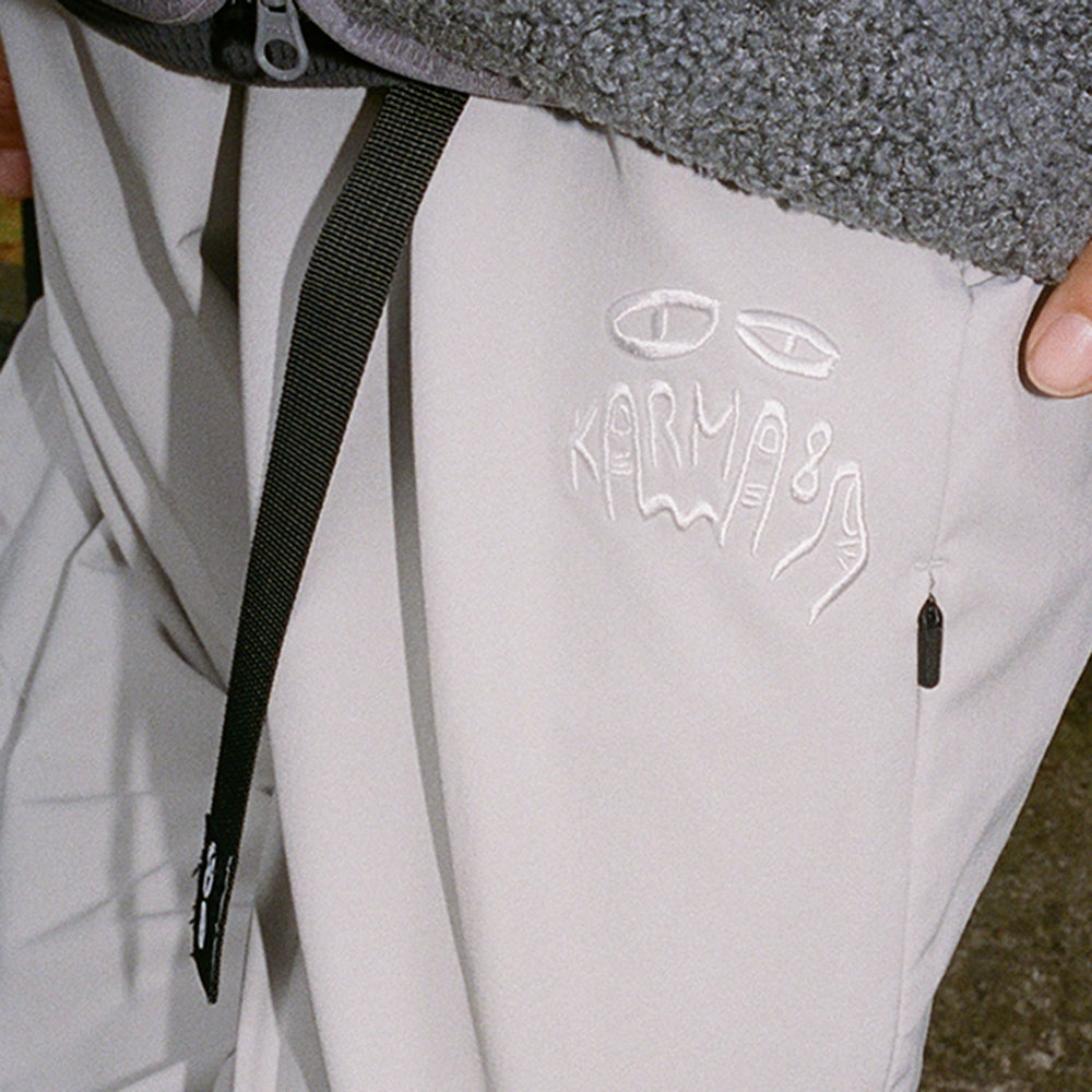 • Embroidered Karma8a logo at leg