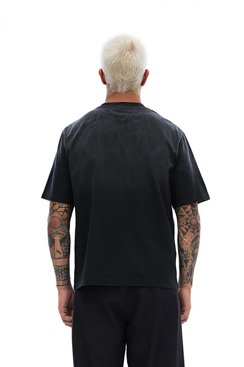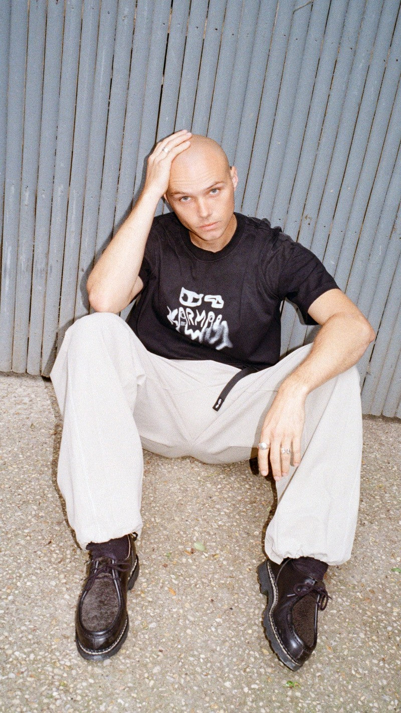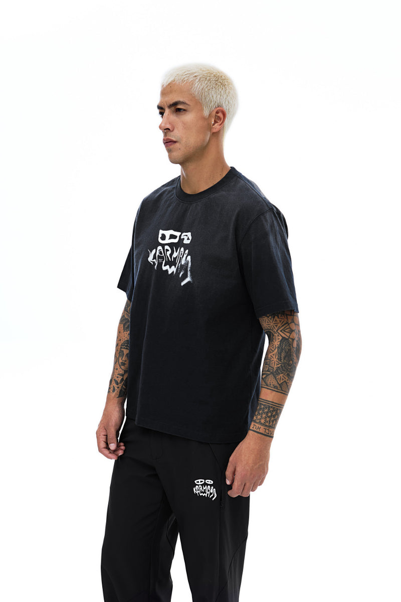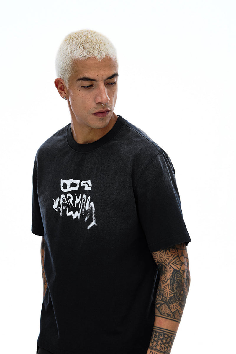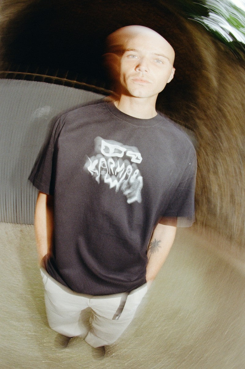 This tee carries that same imprint — the Karma8a logo blurred like a fresh send. Faded, slightly warped, and washed in for that lived-in texture.