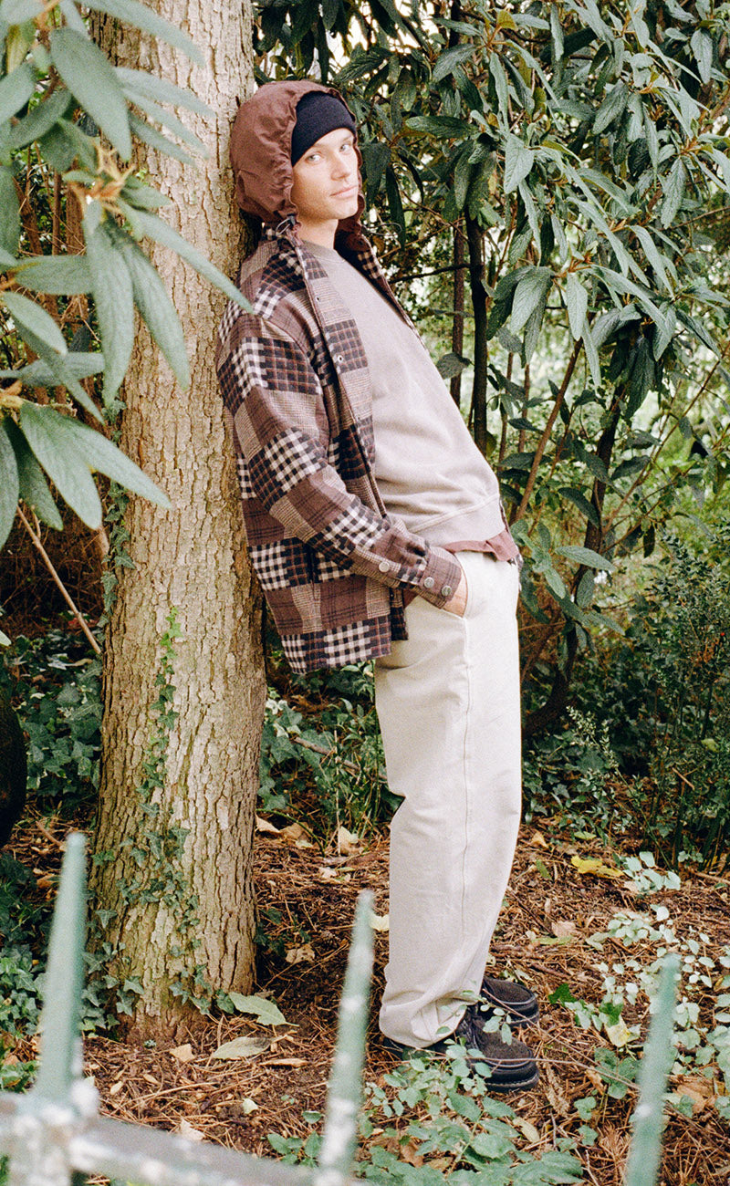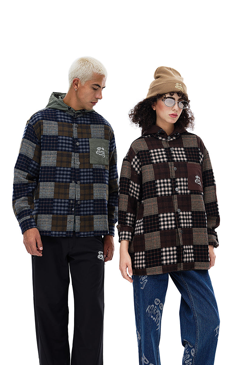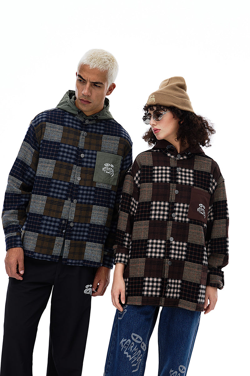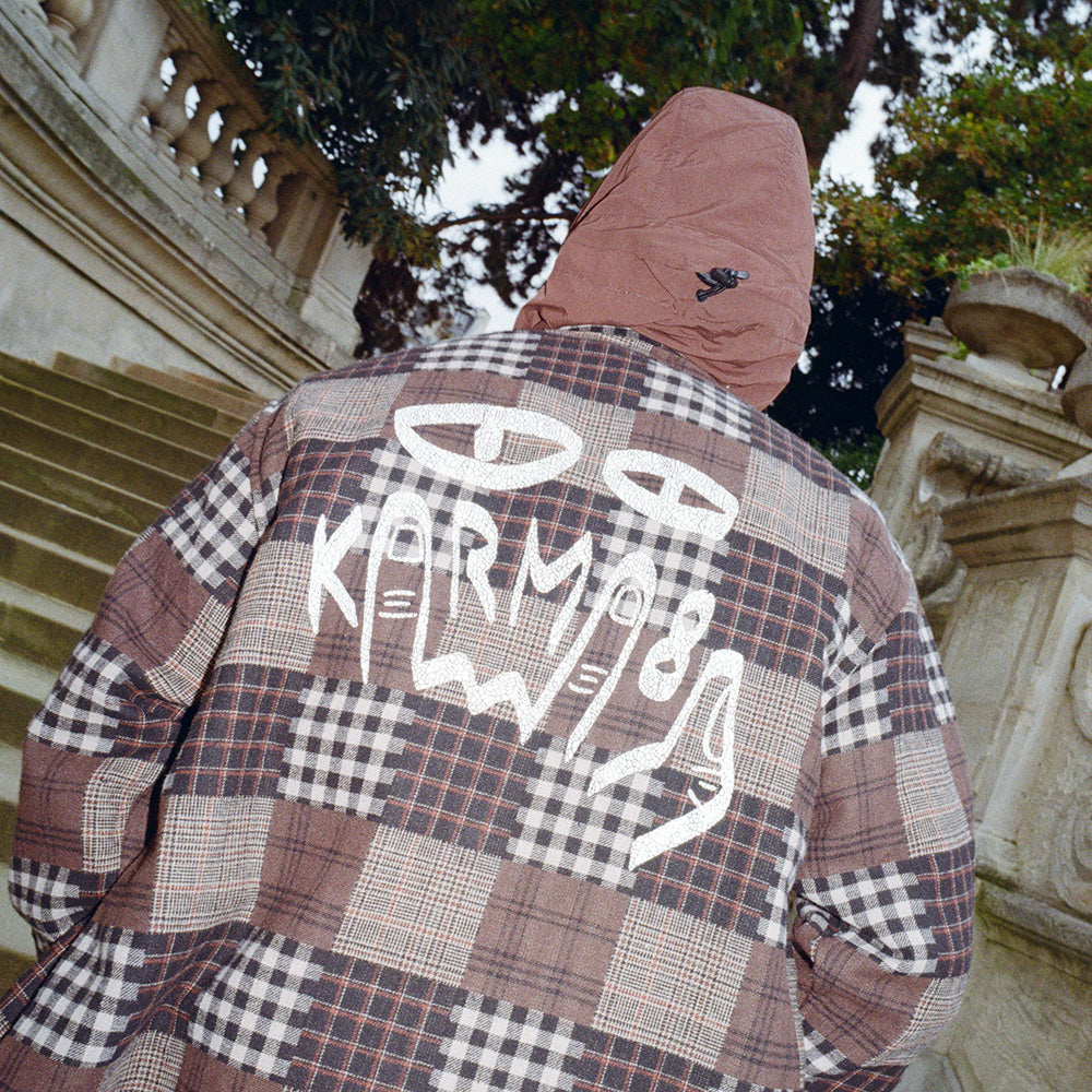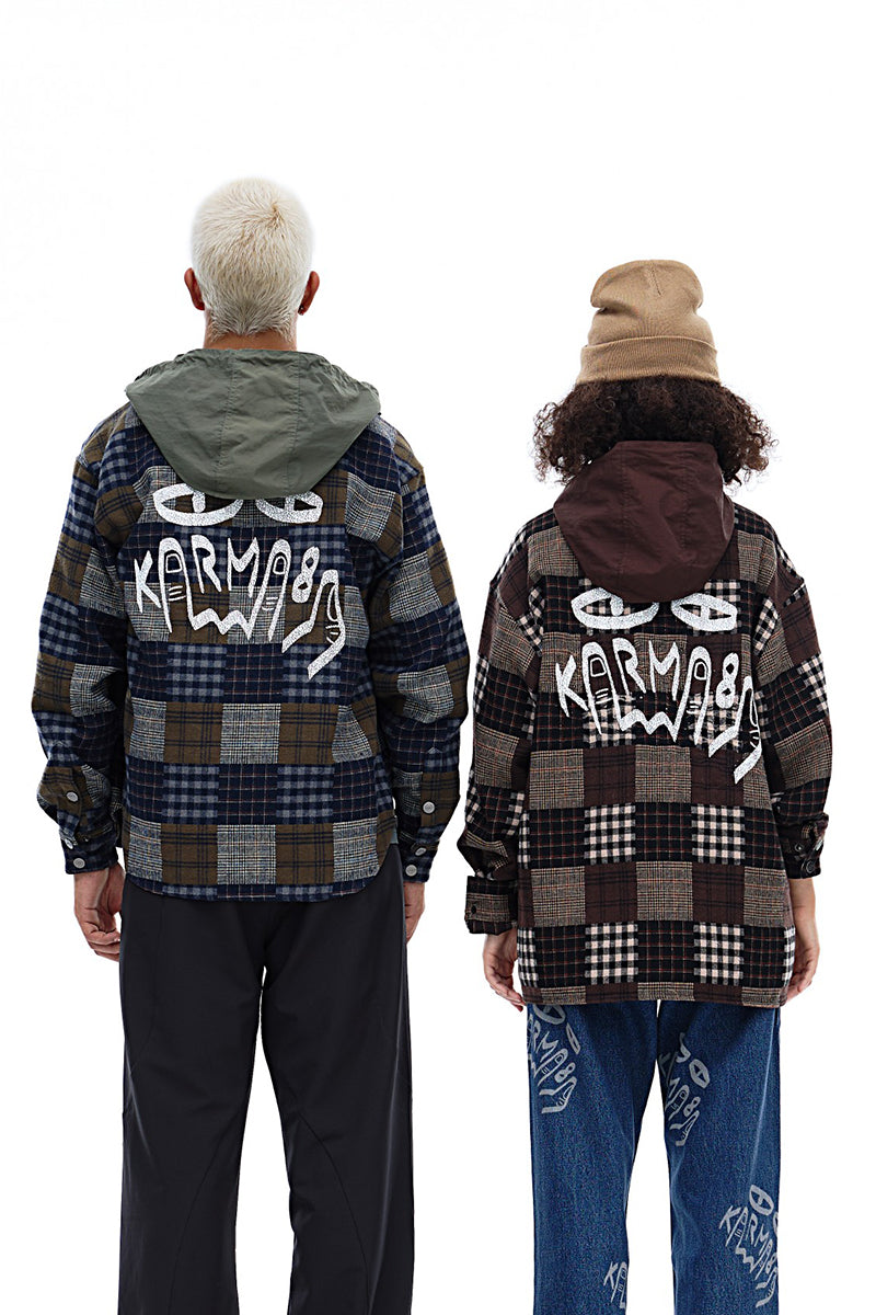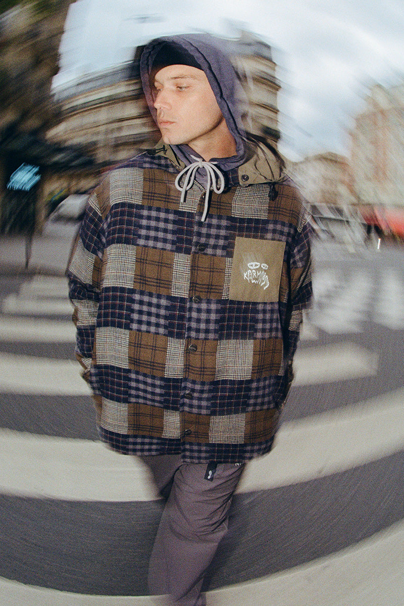 The contrast nylon hood meets check-pattern flannel for a hybrid piece that works hard across seasons. Back hit features our cracked Karma8a logo — a nod to impact, stress, and repetition.
