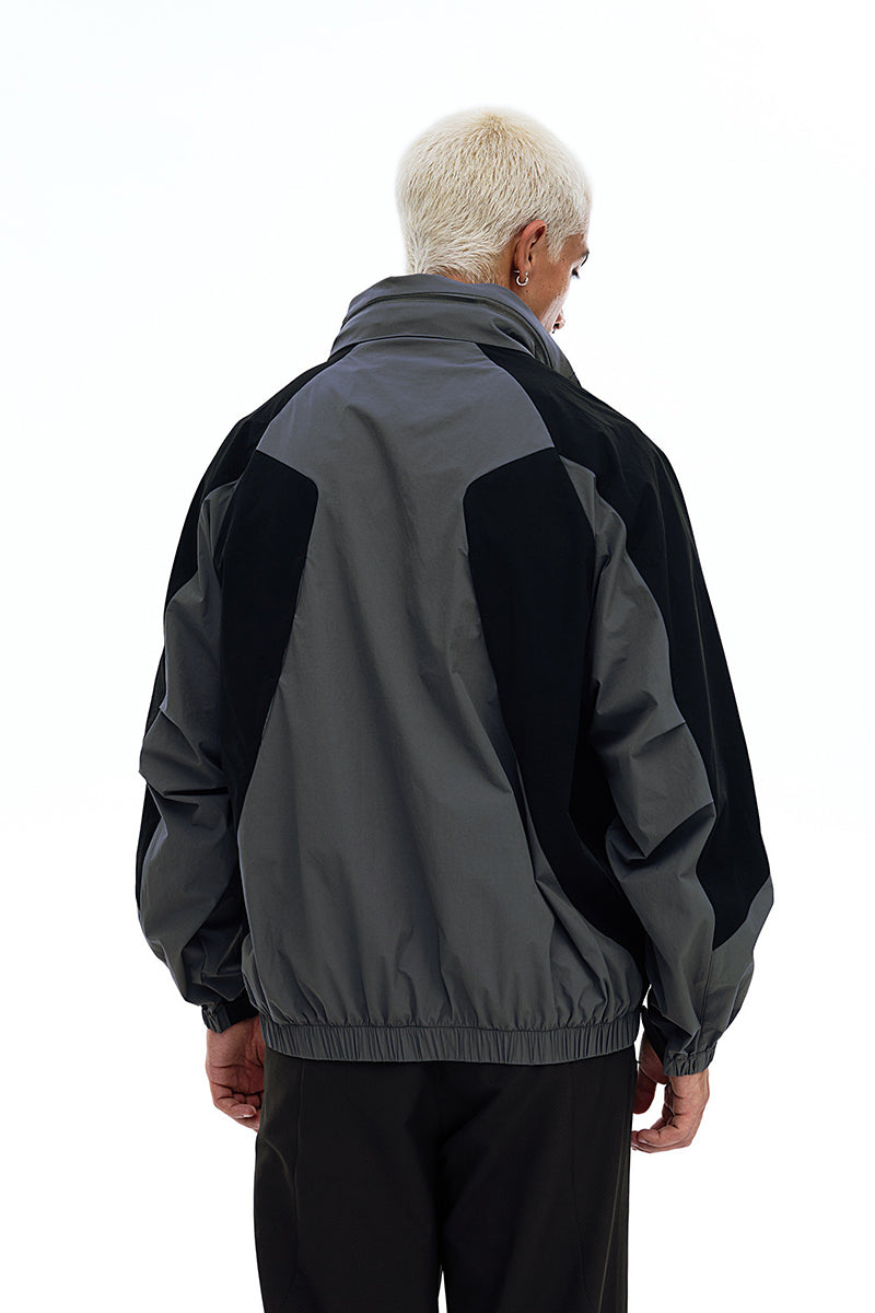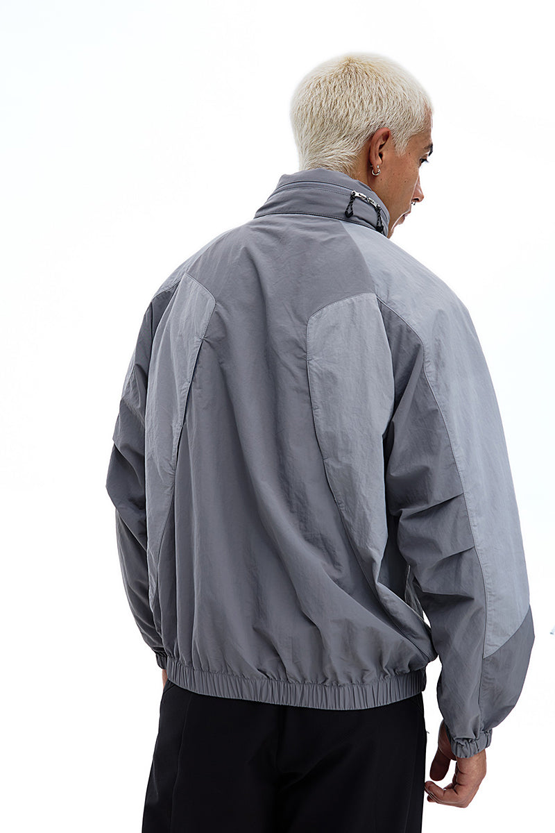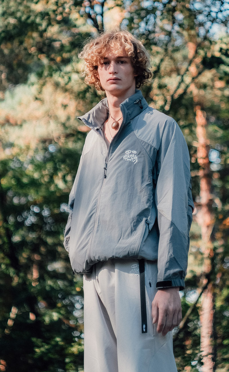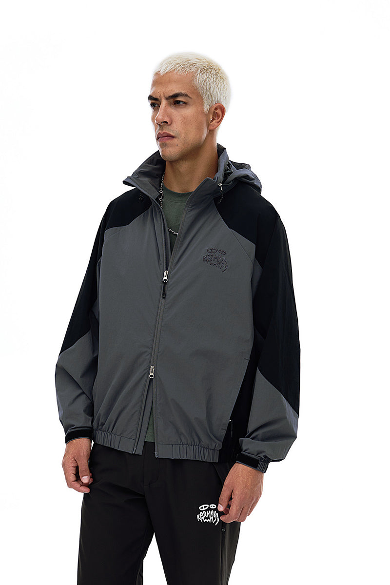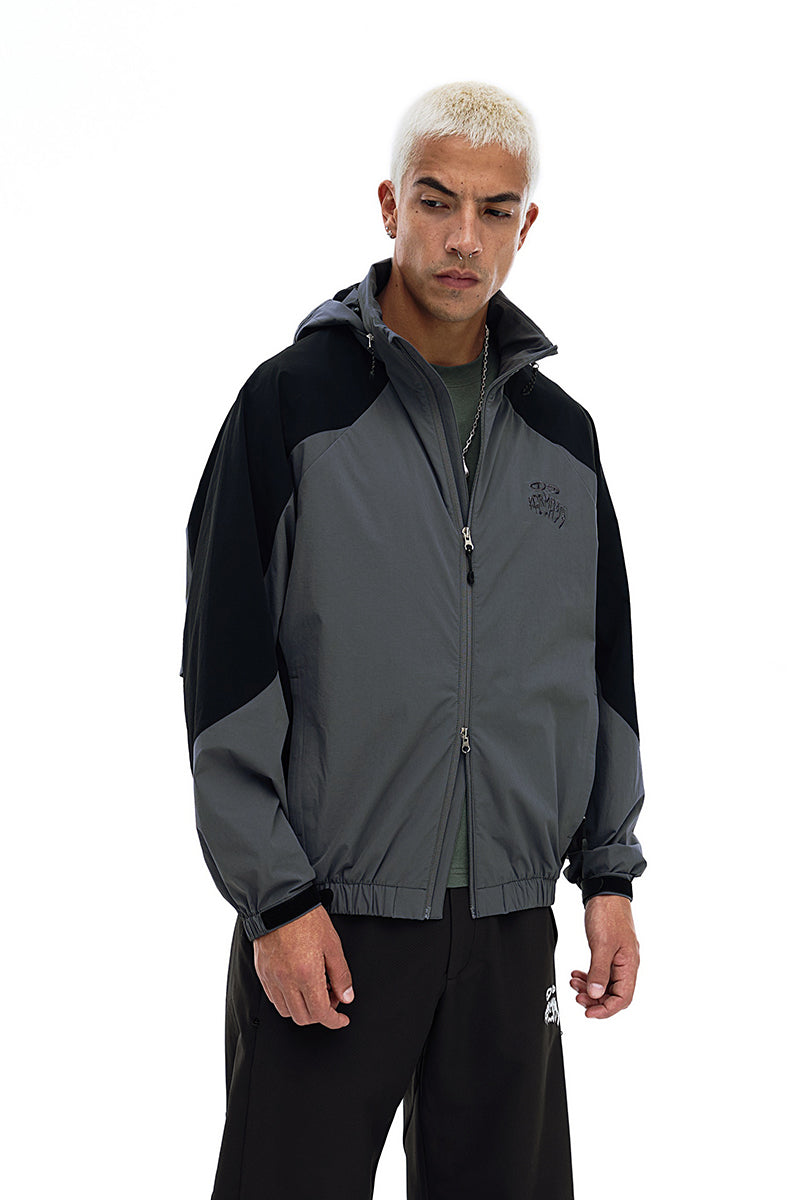 This jacket combines stretch-woven and ripstop nylon in a clean, tonal construction. Back vents and underarm mesh panels manage heat. Hidden hood stays tucked until needed. Quiet branding throughout.