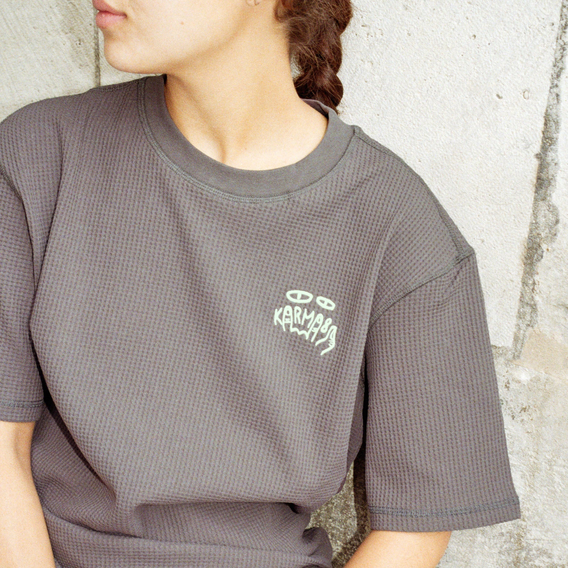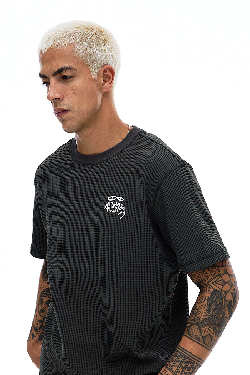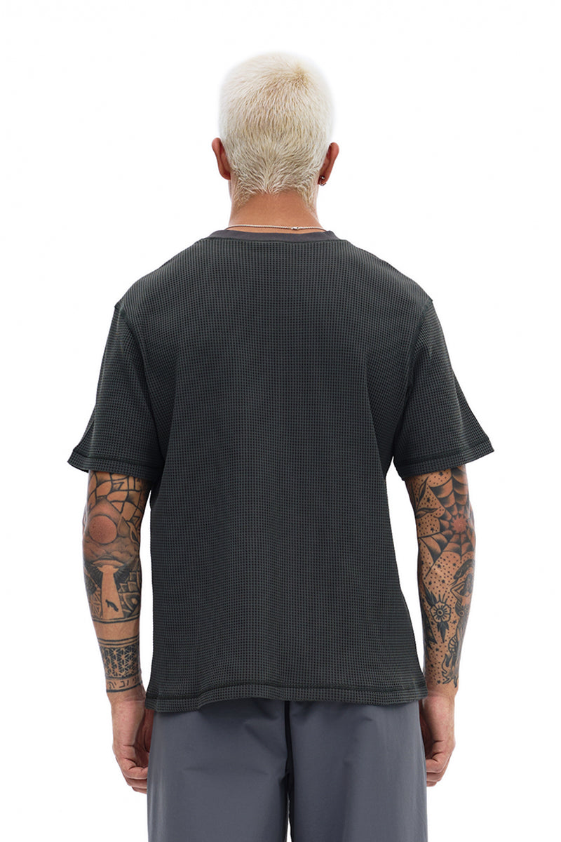 Cut from a lightweight waffle-knit polyester, this tee balances stretch, breathability, and structure. Left chest logo embroidery keeps branding lowkey. Built for movement — whether in motion or not.