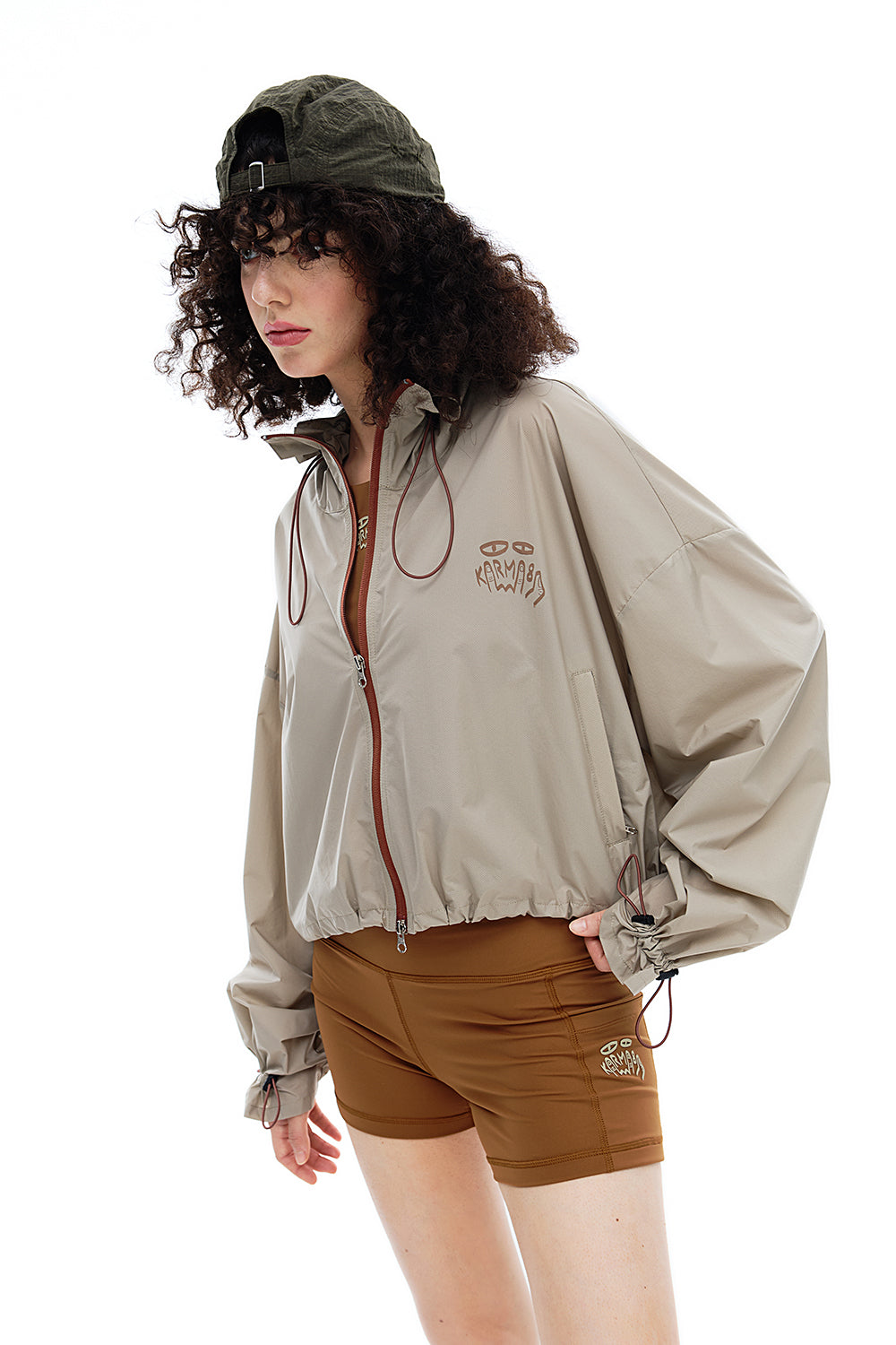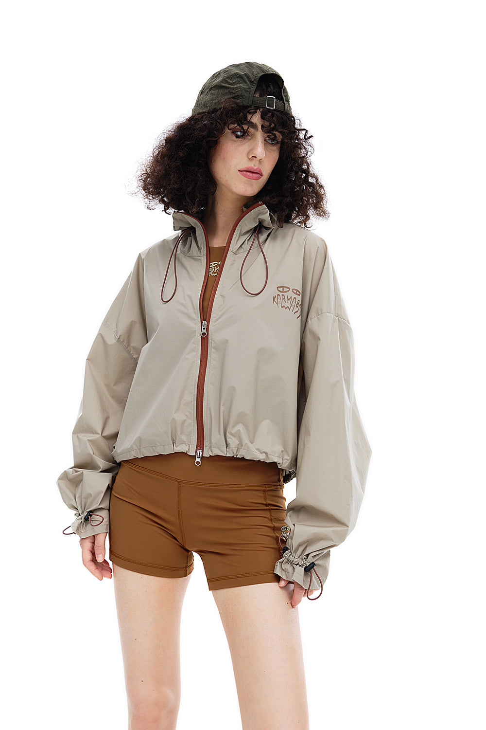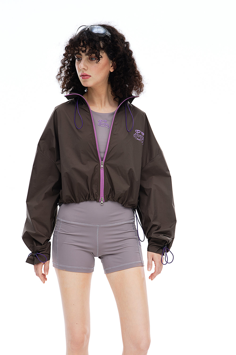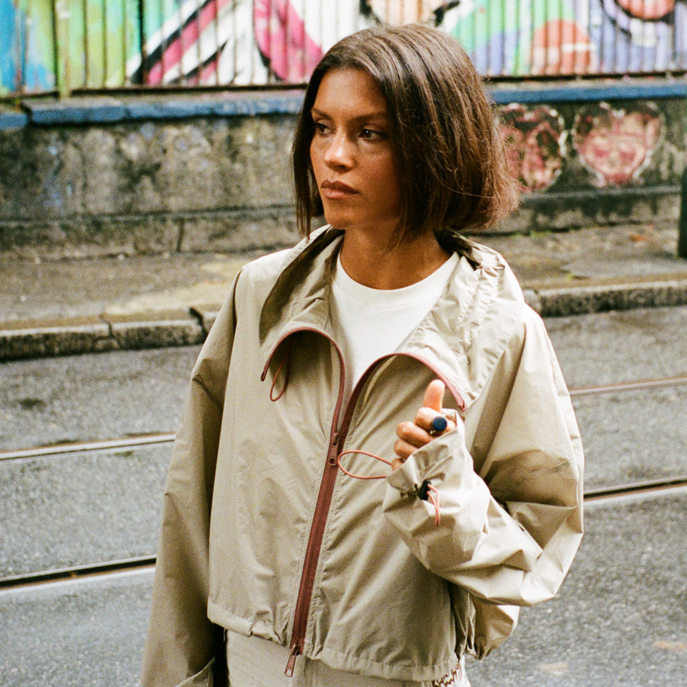 • Cropped silhouette with contrast zippers for urban outdoor style