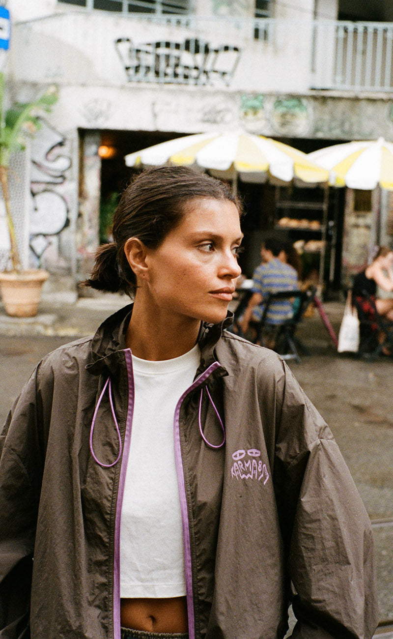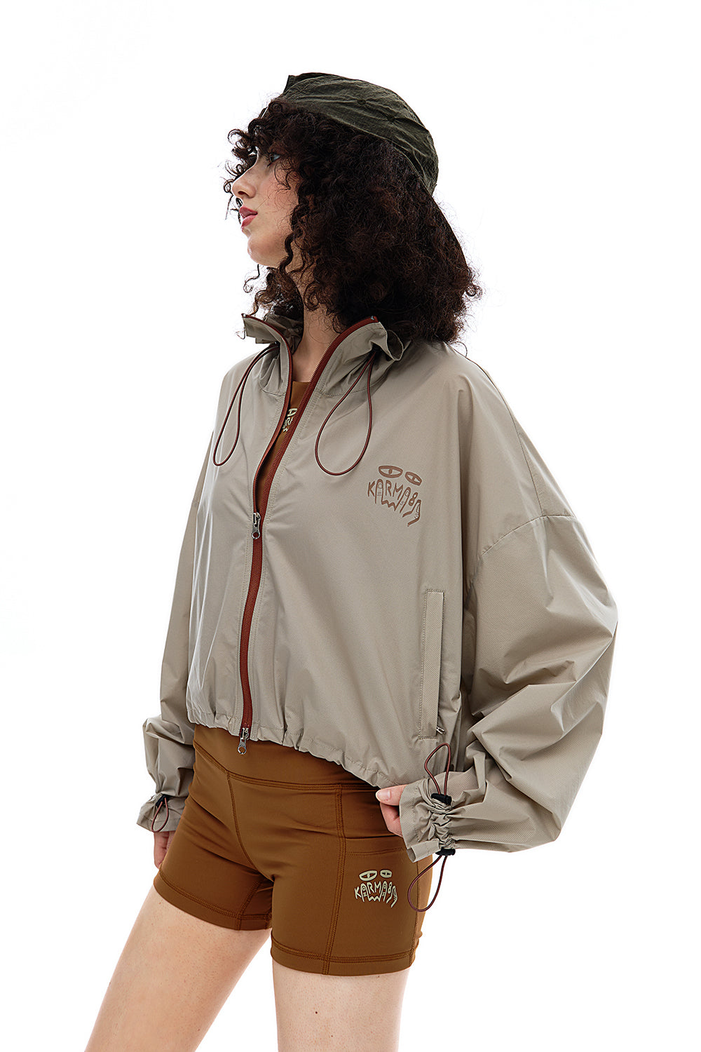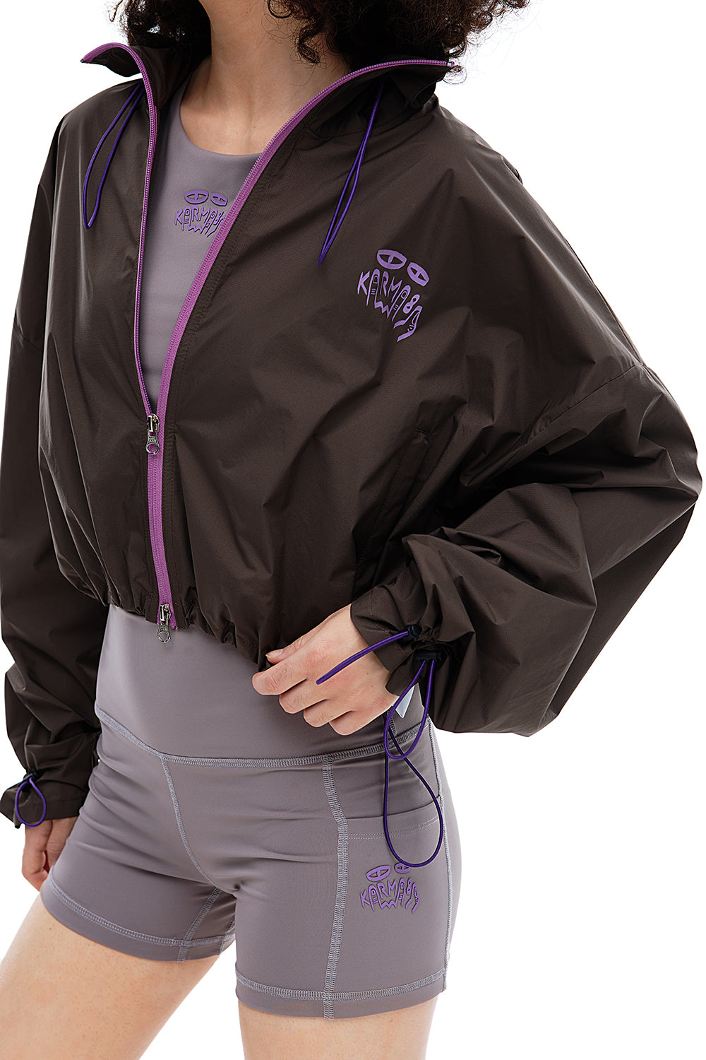 • Cropped silhouette with contrast zippers for urban outdoor style